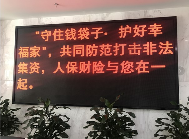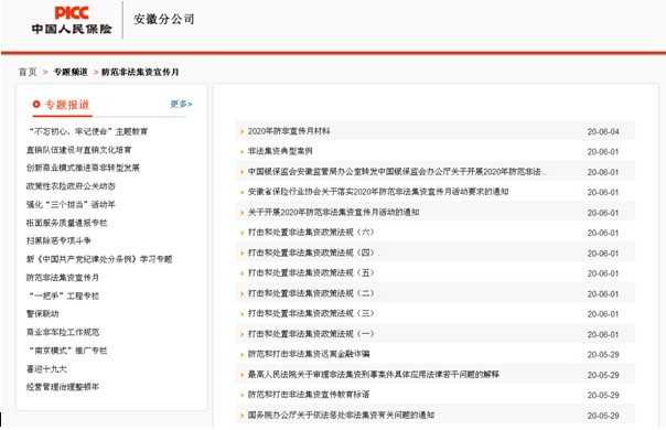 5月26日上午,省公司法律合规部/风险管理部举办防范处置非法集资风险工作专题宣导会,组织省公司各部门业务骨干认真学习2020年防范非法集资宣传月活动文件并宣导防非非法集资相关知识;在省公司内网设立“防范非法集资宣传月”宣传专栏,刊登防范非法集典型案例、宣传教育标语、打击和处置非法集资政策法规知识问答等宣传知识;通过95518给全系统7744名员工短信发送“守住钱袋子·护好幸福家”,共同防范打击非法集资--人保财险与您在一起。